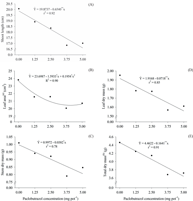 Similar results were also obtained by Takane et al. (2019), with a decrease in the shoot length and leaf and shoot dry mass of desert rose (Adenium obesum) in response to increasing PBZ concentrations. However, no statistical differences were observed for leaf area. Matsoukis et al. (2014) and Carvalho-Zanão et al. (2017) also observed a decrease in leaf area in response to increasing PBZ doses in lantana and rose, respectively. According to Leyser & Day (2015), this reduction in leaf area is due to a decrease in leaf expansion caused by the inhibition of gibberellin synthesis by this triazole.