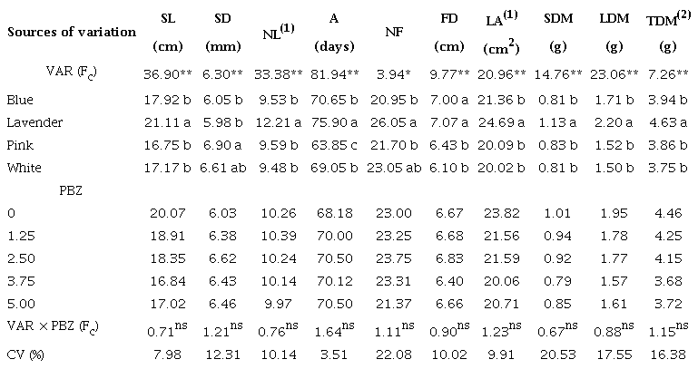 There was no interaction between the factors (varieties and PBZ concentrations) (Table 1). This result indicates that the varieties have similar vegetative and reproductive growth responses to the increasing PBZ doses applied to the substrate. Therefore, the commercial production of ‘Astra Semi-Double’ platycodon as a potted flower may become viable, since the producer will be able to adopt the same concentration of this regulator for the four varieties.