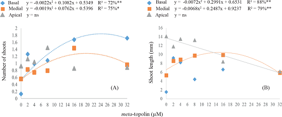 For number of shoots, the basal and medial nodal explants showed an increasing quadratic behavior (p < 0.01), as a function of mT concentrations. However, the apical explant had no representative mathematical model. The quadratic equation obtained for the basal segment indicates that the use of 24.59 µM of mT reaches the highest estimate (1.86 shoots per explant) (Figure 1A). Considering the medial explant, the response curve suggests that the calculated value of 20.05 µM results in 1.30 shoots per explant. The mean values for this variable were 1.68 and 1.43 shoots/explant for the basal and medial explants, respectively (Figure 1A).