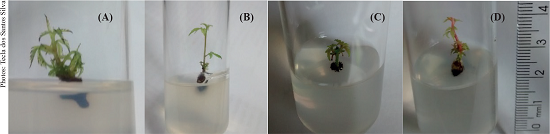 Test tubes (25 x 150 mm) containing 10 mL of woody plant medium (Lloyd & McCown 1980) supplemented with 87.64 mM of sucrose and solidified with 7 g L-1 of agar were used in the experiments. The pH was adjusted to 5.7 ± 0.1 (using 0.1N NaOH or HCl) before autoclaving at 121º C, for 15 min. After inoculation, the tubes were sealed with a polyvinylchloride (PVC) film.