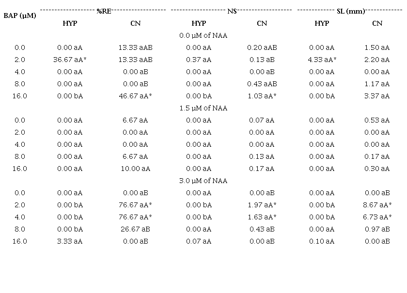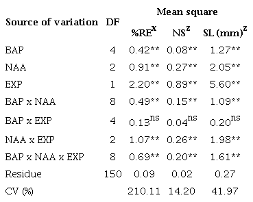 The analysis of variance showed a highly significant effect (p < 0.01) of the triple interaction among the factors ‘BAP x NAA x Explant’ for percentage of explants responsive to shoot regeneration, number of shoots and shoot length (Table 1).