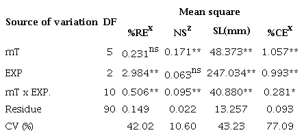 The data were statistically analyzed using the Sisvar software (Ferreira 2011). These were submitted to the Shapiro-Wilk normality test, followed by analysis of variance, being then transformed by the function (x + 1)0.5, except for the percentage data, which were submitted to transformation into arcsine √%. When the “F” value was significant, qualitative data and adjustments were subjected to a comparison of means using the Tukey test, and quantitative data were submitted to polynomial regression analysis. The presented results are the original means obtained.