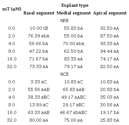 All treatments under study showed callus formation. When the culture medium was added with 32 µM of mT, 80 % of the explants formed calluses with the use of the basal nodal segment; however, without statistical difference from the medial explant (75 %) in the same mT concentration. The value for the first explant did not differ from the percentages (55.56 and 66.33 %) for the same explant at 2.0 and 16 µM of mT, respectively (Table 4).