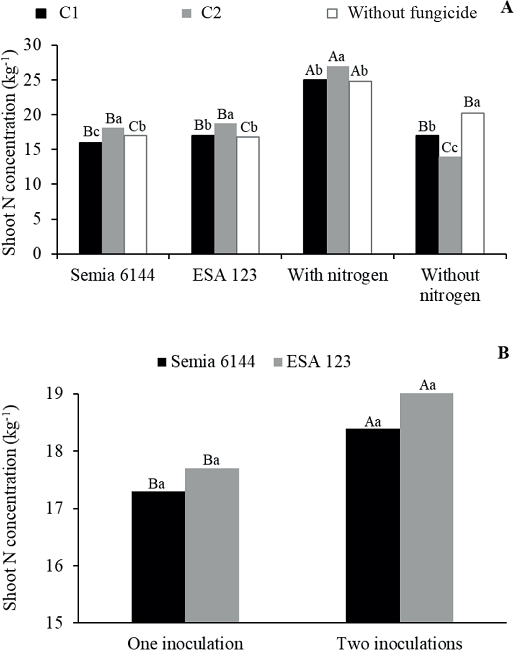 The use of C2 had no negative effect on the accumulation of nitrogen in the shoots. Considering the positive increments of this fungicide in other variables already evaluated in this study, C2 also provided positive increments in the concentration of N in all evaluated treatments, except for the uninoculated and non-nitrogen control (Figure 1). Fagan et al. (2010), while evaluating the effect of the application of pyraclostrobin on physiological variables, observed an increase in the photosynthetic rate and, consequently, a greater phytomass production. However, the authors emphasize that the increase in phytomass in plants does not only require carbon assimilation through increased photosynthesis, but also nitrogen availability.