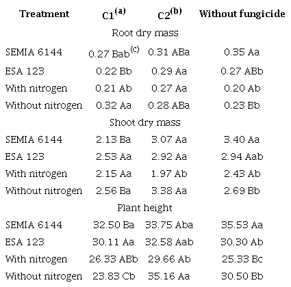 No differences were observed for C1, in relation to the control without fungicide, for root dry mass, shoot dry mass and plant height, although a restriction in shoot dry mass was noted (11 % in relation to the control without fungicide). Increments were verified in treatments with C2 in plants inoculated with ESA 123 (7 % for root dry mass and plant height) (Table 1), while, with SEMIA 6144, root dry mass and plant height were similar to the control without fungicide. These effects may be related to the presence of pyraclostrobin in the product composition, which is reported to be involved in plant growth improvement. The results found in this study corroborate Balardin et al. (2011), who recorded increases in the production of root dry mass and plant height when soybean seeds were treated with pyraclostrobin-based fungicides.