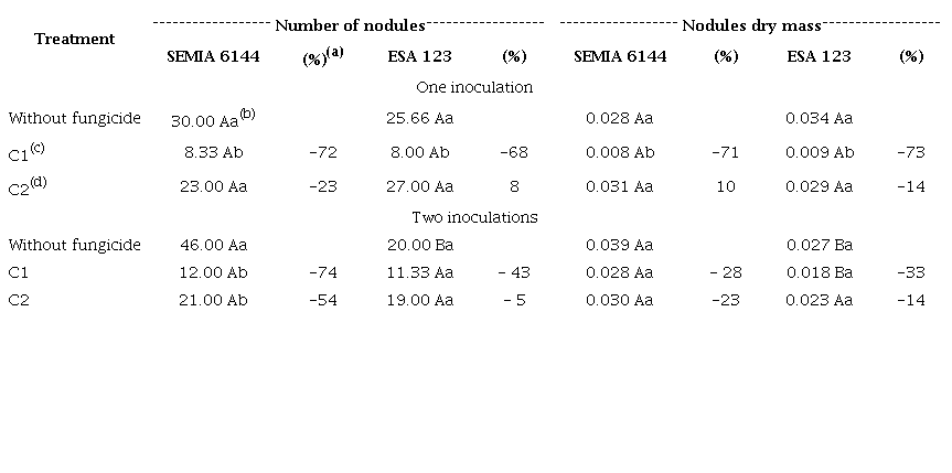 There were differences in the number of nodules and nodules dry mass produced by the evaluated strains, and the fungicides negatively affected (p < 0.01) these variables, regardless of the number of inoculations, although the second inoculation favored a better nodulation of the plants, even in the presence of fungicides (Table 2).