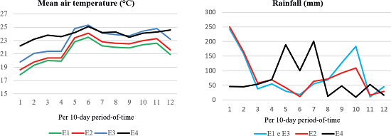 The rainfall and temperature data recorded for the analyzed period were collected at the Empresa de Pesquisa Agropecuária e Extensão Rural de Santa Catarina (Epagri)/Centro de Informações de Recursos Ambientais e de Hidrometeorologia de Santa Catarina (Ciram) (Epagri 2020) and estimated based on equations (depending on altitude) developed by Massignam & Pandolfo (2006). The data of mean rainfall and temperature rates used in the experiment conducted in Florianópolis were collected at the Florianópolis surface meteorological station of the Instituto de Controle do Espaço Aéreo (ICEA).