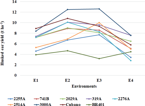 The G x E interaction was significant for husked ear yield, mainly in the varieties 2514A and 2276A (Figure 2). The variety 2514A showed a good performance in Anchieta (altitude: 422 m) for this variable (10 t ha-1, on average), although it did not exceed 6.9 t ha-1 in the other evaluated environments. The low altitude did not favor the variety 2276A, since it recorded a mean husked ear yield of 2.8 t ha-1 in Florianópolis (altitude: 5 m), whereas it recorded a mean husked ear yield value higher than 7 t ha-1 in the other environments. The control variety BR401 presented a varying husked ear yield among the environments: mean yield of 4.5 and 4.7 t ha-1 in Florianópolis (altitude: 5 m) and Guaraciaba (altitude: 624 m), as well as 3.2 and 3.9 t ha-1 in Anchieta (altitude: 422 m) and Anchieta (altitude: 717 m), respectively, on average.