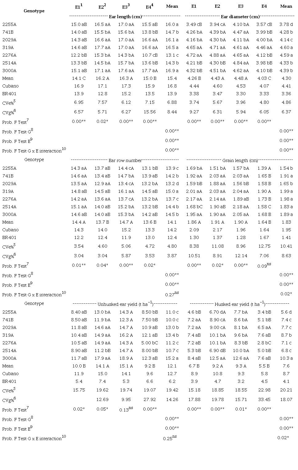 The genotypes 3000A, 319A, 2029A and 2255A recorded the highest means for husked ear length in the four analyzed environments (16.9, 16.5, 16.1 and 16.0 cm, respectively). The varieties planted in Anchieta (altitude: 717 m) and Florianópolis (altitude: 5 m) recorded the lowest husked ear length values, on average. The control variety Cubano showed a lesser variation between the mean values for this variable in the environments (Table 1).