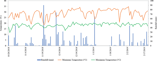 The weather conditions remained in the ideal range for conducting the crop, with an average temperature of 23.5 ºC, minimum temperature of 11.8 ºC and maximum temperature of 34.2 ºC. The accumulated rainfall from sowing to harvest of the later cultivars (October 28, 2018 to Feb. 04, 2019) was 737.8 mm (Figure 1).