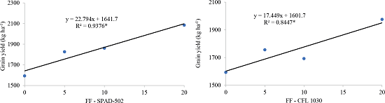 Both in the experiment with the SPAD-502 chlorophyll meter and in the one evaluated by the CFL 1030, for the TAA Gol cultivar, the response in relation to grain yield was linear and positive, with maximum values estimated for yield equal to 2,097 kg ha-1 (SPAD-502) and 1,950 kg ha-1 (CFL 1030), referring to doses of 118 kg ha-1 and 40 kg ha-1 of N, respectively (Figure 2). This is because the N doses supplied as topdressing did not provide the maximum grain yield points in any of the experiments carried out with the use of the respective chlorophyll meters. Nunes et al. (2021) suggested that the TAA Gol cultivar is inefficient and responsive to N topdressing.