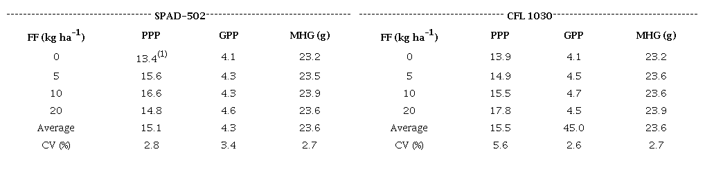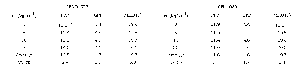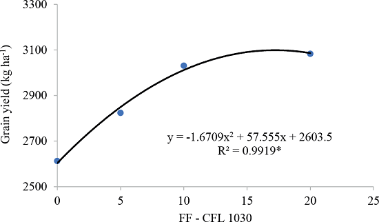 For the BRSMG Uai cultivar, the N doses established based on the SPAD-502 chlorophyll meter significantly modified the number of pods per plant and grain yield. The number of pods per plant responded in a quadratic way to the fertilization factor of 11.4 kg ha-1 of N for each 1 % below the NSI of 92 %, corresponding to the dose of 56 kg ha-1 of N, providing 16.7 pods plant-1 (Table 3). Only yield was influenced in the experiment conducted using the CFL 1030 device (Figure 5).