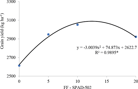 In the experiment using the SPAD-502 chlorophyll meter, the maximum grain yield was estimated at 2,745 kg ha-1, reached with a dose of 71 kg ha-1 of N, corresponding to a fertilization factor of 14.5 kg ha-1 of N for each 1 % below the NSI of 92 %. In relation to the CFL 1030 chlorophyll meter, the fertilization factor responsible for estimating the point of maximum grain yield was 15.8 kg ha-1 of N for each 1 % below the NSI of 93 %. The N dose defined by this combination between the fertilization factor and the NSI was 77 kg ha-1, with the maximum yield estimated at 2,740 kg ha-1.