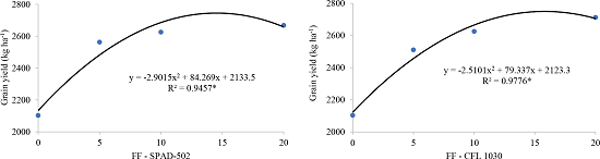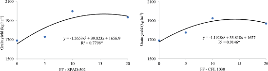 Regarding grain yield, the experiments carried out with the chlorophyll meters responded in a quadratic way to the N doses defined according to the different fertilization factors tested (Figure 6).