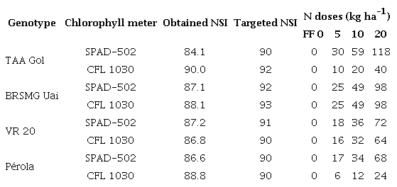 Table 1 describes the genotypes and chlorophyll meters used, the obtained NSI, the desired NSI and the N doses, defined according to the fertilization factors.