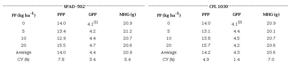 For the Pérola cultivar, the grain yield was significantly affected by different N doses defined according to the fertilization factors, in the experiment conducted with the SPAD-502 chlorophyll meter. The fertilization factor defined at the maximum point for mass of 100 grains was 13.9 kg ha-1 of N for each 1 % below the NSI of 90 %. Fornasieri Filho et al. (2007) and Binotti et al. (2009) reported an influence of different N doses supplied as topdressing for the Pérola cultivar, in relation to the mass of 100 grains. On the other hand, the grain yield of the Pérola cultivar was not modified by the application of N doses defined according to the fertilization factors, in the experiment carried out with the CFL 1030 chlorophyll meter. Figure 3 shows the averages for grain yield achieved with the use of the CFL 1030 chlorophyll meter, according to the fertilization factors and their respective N doses as topdressing. According to Zeffa et al (2021), the Pérola cultivar has a high adaptability and stability for seed yield, even under high or low N doses. Thus, no response is expected from this cultivar to fertilization factors.