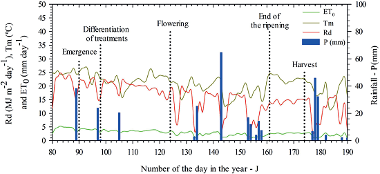 The irrigation management was employed in response to the weather, with meteorological data collected daily at a station located 50 m from the experimental area. Meteorological data of solar radiation; minimum, mean and maximum temperature; wind speed at 2 m above the ground; and relative humidity were used to calculate the reference evapotranspiration (ET0), with the Penman-Monteith equation (Allen et al. 1998).