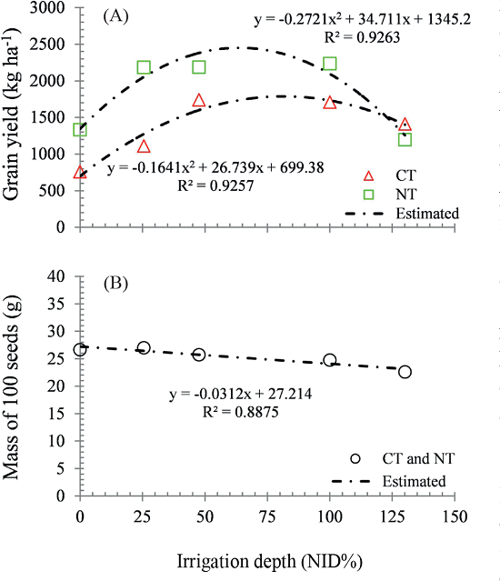 The grain yield and mass of 100 seeds values, as a function of the percentage of net irrigation depth applied, are depicted in Figure 2. The increase in the irrigation application depth resulted in a quadratic grain yield response for both the soil management systems (Figure 2A). The adjusted quadratic polynomial equations represent more than 90 % (R2 > 0.9) of the bean grain yield response to the irrigation depths.