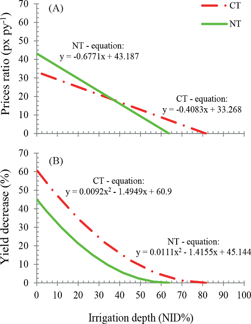 In irrigated bean production scenarios, when the price ratio between water and bean (px py-1) presents values higher than zero, it could be economically profitable to perform deficit irrigation and apply a fraction of the irrigation depth. Hence, in the conventional tillage and no-tillage systems, respectively when the costs to pump 1 mm of water are 33.27 and 43.19 times higher than 1 kg of bean (Figure 3A), working with rain-fed agriculture and having decreases in grain yield of 60.9 % (y = 699.4 kg ha-1) and 45.1 % (y = 1,345.2 kg ha-1) could be economically profitable (Figure 3B).