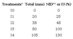 In the soil water balance for irrigation management, data on soil moisture in saturation (0.311 m3 m-3), field capacity (0.196 m3 m-3) and wilting point (0.066 m3 m-3) were determined on the soil retention curve from the experimental area, respectively for soil water tensions of 0, 6 and 1,500 kPa. The effective rooting depth was defined as 0.3 m, and the soil water depletion fraction for no stress (p) was 0.4. Therefore, the net irrigation depth to raise the soil moisture to field capacity (treatment I3) represented the sum of the ETcadj minus the rainfall collected in the experimental area.