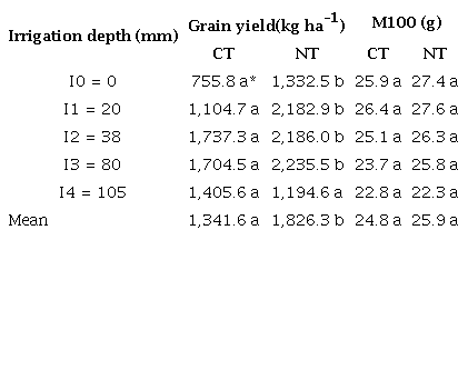 ABSTRACT: Yield response data of crops to soil and water management are vital for maximizing profits. This research aimed to evaluate the yield of the ‘IPR Andorinha’ bean cultivar under distinct irrigation depths (0, 25, 48, 100 and 130 % of the net irrigation depth) and tillage systems (no-tillage and conventional tillage), during the Brazilian fall season. The experimental design was in strips with subdivided plots and four replications, with the factor soil management in the plot and irrigation depths in the subplot. No-tillage had an average grain yield 26.5 % higher than that of the conventional tillage. Both the soil management treatments presented a quadratic response (R2 > 90 %) to the irrigation depths applied, and the maximum yields were reached at 63.8 % (y = 2,452 kg ha-1) and 81.8 % (y = 1,789 kg ha-1) of the irrigation depth, respectively for the no-tillage and conventional tillage. However, the irrigation of bean cropped in the Brazilian fall season is not economically feasible for the no-tillage and conventional tillage when the price of the water millimeter is 43.19 and 33.27 times higher than the price of the bean kilogram, respectively, resulting in yields of 1,345.2 and 699.4 kg ha-1.