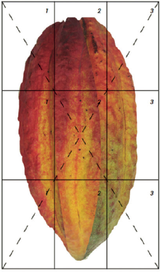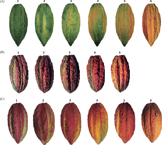 Color scales is one of the most widely used non-destructive methods for characterizing the fruits maturity stage, as it enables the association of physicochemical parameters such as sugar content, pH, acidity, maturity index and fruit peel color. This method is widely used when determining the maturity stage of apples (Cárdenas-Pérez et al. 2017) and olives (Avila et al. 2015). However, this tool does not exist for cacao, as there are many different varieties that develop different color patterns, what means that each clone needs its own proper color scale. The development of a color scale for every cacao clone would be a key tool in reducing the heterogeneity of the raw material in the production of cacao for the chocolate industry.