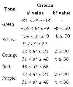 To accurately detect color, systems such as the CIELAB have been established. This system is based on three coordinates: luminosity (L*), difference between green (-a*) and red (+a*) and between blue (-b*) and yellow (+b*) (Sahin & Summu 2006), which allow the characterization of colors in the visible spectrum.