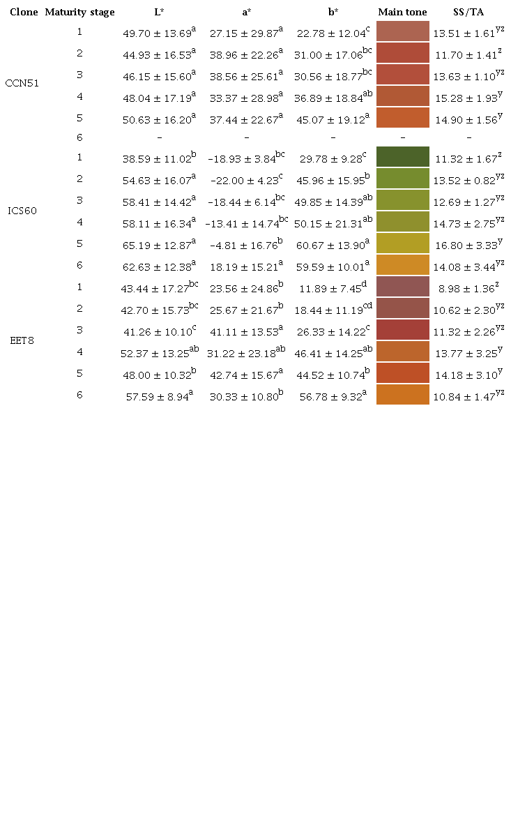 The color parameters (L*, a* and b*; main tone) and maturity index (SS/TA) for each one of the studied clones and maturity stages are depicted in table 2. The main tone corresponds to the tone that covers most the surface of the cacao pod, while L*, a* and b* represent the color parameters of that main tone.
