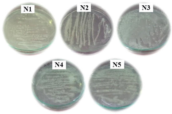 The results showed that the shape of the N-fixing bacteria isolates varied widely, namely circular, concentric, irregular and diffuse. The dominant types of isolates (N1, N3, N4 and N5) showed raised elevation, and only one isolate (N2) had flat elevation. The edges of the isolates also varied, namely wavy, slippery and irregular. It was found that four isolates (N1-N4) had a white color, and only one isolate (N5) had a clear color. This suggests that the N-fixing bacteria isolates from the oil palm rhizosphere are still able to survive in very acidic soil conditions (pH 4.18), or the bacteria were classified as acidophilic microbes. According to Waluyo (2004), microbes that could be growing within a soil pH ranging from 2 to 5 are classified as acidophilic.