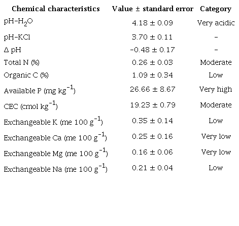 Soil samples of 100 g were collected to evaluate the chemical characteristics of Ultisols by analyzing the soil pH (H2O and KCl) with the electric method, total N by the Kjeldahl method, organic C by the Walkley and Black method, available P by the Bray-II method, cation exchange capacity (CEC) and base saturation (K, Ca, Mg and Na) with the NH4OAc extraction method (pH 7).