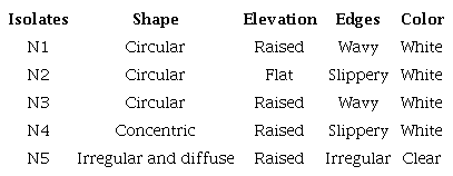 The morphological characteristics of the N-fixing bacteria isolates from the oil palm rhizosphere, based on shape, elevation, edges and color, are presented in Table 3.
