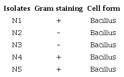In the present research, five N-fixing bacteria were isolated from the oil palm rhizosphere, with varied shapes (circular, concentric, irregular and diffuse) and edges (wavy, slippery and irregular), and the dominant type of isolates showed a raised elevation. Four types of isolates presented a white color and only one a clear color. Three Gram-positive and two Gram-negative bacteria isolates showed a bacillus shape.