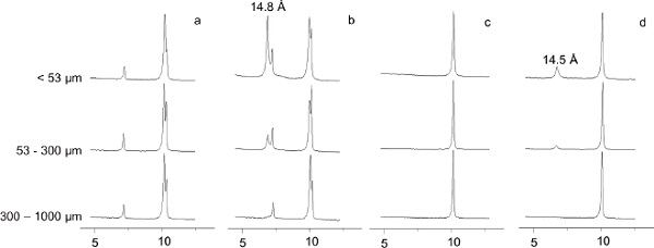 After 315 days of successive growth, the greatest XRD pattern changes occurred in the finer size fraction (< 53 µm; Figure 1). The formation of interstratifed mica-vermiculite, even as to the coarser particle size fraction (53-300 µm), was also observed for the BSC and BSY (Figure 1). This upshot shows that coarser particles are not chemically inert in a short time scale.