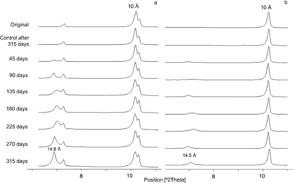 The XRD pattern from the BSC after each of the seven cycles (totaling 315 days) showed a progressive process of vermiculitization (Figure 2). The edges of the Mg-biotite grains expanded and, consequently, characteristic broad reflections for the new-formed hydrous mica were detected. Hydrobiotite - a precursor of vermiculite - is a mica that has gained water by losing a part of its K content. The hydrobiotite reflection at 14.8 Å emerged gradually, as roots extracted K from biotite interlayers. Mohammed et al. (2014) classified a corresponding appearance of the reflection at 14.8 Å in weathered biotite as a clear, defined, 002 vermiculite reflection.