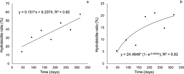 The X-ray diffraction analysis of biotite and hydrobiotite reflection areas were used to estimate their relative percentages over time (Figures 3 and 4). The decrease in the biotite reflection area was related to the formation of hydrobiotite in the BSC along the time (Figure 3a; Equation 1). Thus, the hydrobiotite formation rate was negatively correlated with biotite on the < 53 µm size fractions (Pearson’s correlation, r = -0.88; p < 0.05). This result indicated that the incongruent dissolution of Mg-biotite was the source for the hydrobiotite formation in the BSC samples.