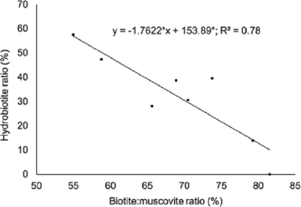 The transformation rate of biotite into hydrobiotite for both the BSC and BSY was estimated by XRD reflection areas, using the Equation 1: Hydrobiotite:biotite ratio per cycle (%) = [(hydrobiotite reflection area)/(hydrobiotite reflection area + biotite reflection area)] x 100. The reflection area was used to estimate a ratio for the biotite:muscovite ratio from the BSC by the Equation 2: Biotite:muscovite ratio per cycle (%) = [(biotite reflection area)/(biotite reflection area + muscovite reflection area)] x 100.