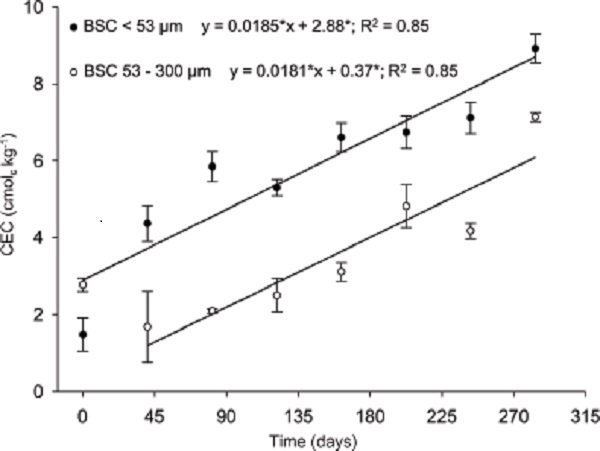 Nevertheless, < 53 µm and 53-300 µm fractions from the BSC showed hydrobiotite in the XRD patterns (Figure 1) and were analyzed for CEC. Along the growth cycles, the BSC showed a progressive increase in CEC (Figure 6). The CEC on the < 53 µm and 53-300 µm fractions increased along the experiments, respectively from 1.48 and 2.77 cmolc kg-1 to 8.91 and to 7.13 cmolc kg-1, after 315 days of continuous growth.