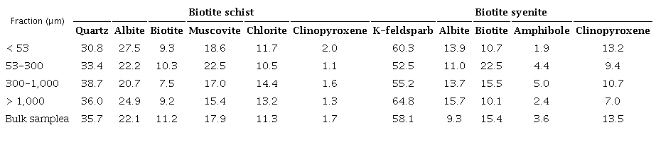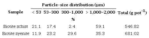 The K uptake by plants was specific for each rock; however, it was not related to the total concentration of this element in the rocks. Although the total K and biotite contents in the BSY bulk sample were higher than in the BSC (Tables 2 and 3), the total K oftake was lower in plants grown in the BSY. Therefore, biotite in the BSC was more susceptible to weathering than the K-feldspars and biotite found in the BSY.