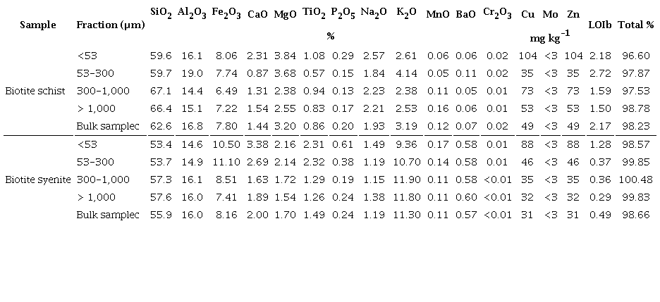 The chemical and mineralogical composition of bulk samples and fractions (Tables 1, 2 and 3) showed the presence of biotite in both the BSC and BSY, which is the main active mineral likely to weather, releasing nutrients such as K, Ca, Mg, Fe and Mn (Table 3).