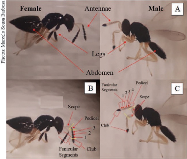 To evaluate the influence of pupal age on the host, a 24-h-old female T. howardi, which had been fed pure honey, was initially introduced into a glass tube (150 mm long × 20 mm wide) containing one C. includens pupa with 24, 48, 72, 96, 120, 144 or 168 h of age, at a density of 1:1 (parasitoid and pupa), and these tubes were sealed with cotton. To determine the sexes of the parasitoids, the taxonomic identification of the parasitoid was based on the dimorphism of the antennae of T. howardi. The females’ antenna has three dark funicular segments and scape without a sensory plate on the ventral margin. The males’ antenna has four segments, with only the club being dark, and their scape has a sensory plate on the ventral margin (La Salle & Polaszek 2007) (Figure 1).