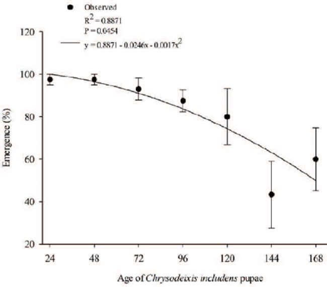 The natural mortality of C. includens was determined by placing 50 pupae individually in 100 mL plastic pots and counting the number of emerged adults. Thus, the natural mortality of the host was defined by the Abbott (1925) formula: Mc (%) = (%Mo - %Mt)/(100 - %Mt) × 100, where Mc is the corrected mortality, Mo the observed mortality and Mt the control mortality.