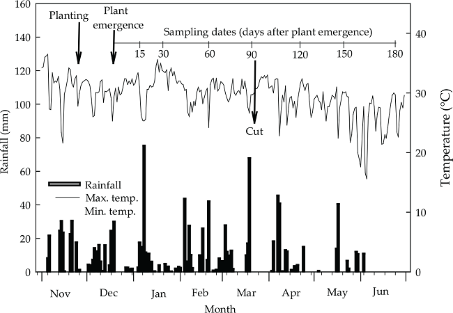 According to the Köppen classification, the climate in the study area is Cwa, subtropical, with relatively dry winters and wet summers, and average annual temperature and rainfall of 22 ºC and 1,552 mm, respectively. The rainfall and maximum and minimum temperatures recorded daily during the experiment are presented in Figure 1.