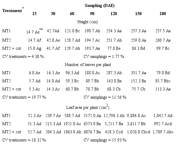 The effects of the treatments on plant height, number of leaves per plant and leaf area are shown in Table 1. The MT1 and MT2 treatments, which did not involve cutting, did not differ in height, except at 60 DAE, when plants with the largest spacing obtained the lowest values. These results corroborate those by Giomo et al. (2001), who studied two inter (75 and 100 cm) and intra-row spacings (7 and 10 cm) and found no significant difference in plant height. In the present study, the tallest plants were observed from 120 to 180 DAE, with values varying from 254.3 to 257.5 cm in MT1 and 259.0 to 260.7 cm in MT2. These values are similar to the 270.0 cm reported by Miranda et al. (1989) for the IAC-Fava Larga cultivar and the 163 to 180 cm reported by Marchi et al. (1984) for planting carried out in January, but are higher than the 91 to 94 cm described by Giomo et al. (2001) for planting in March. From 150 DAE, in the aforementioned treatments, the height remained constant at flowering, when the apical bud becomes a floral bud and growth stops. The plant height was similar among the treatments until 90 DAE, when the first cut occurred in MT2 + cut, period in which the maximum height was observed, with a value of 194.7 cm.