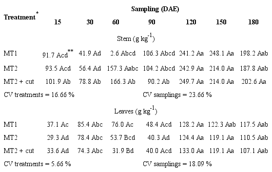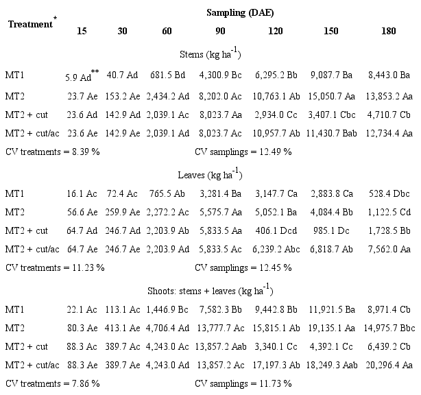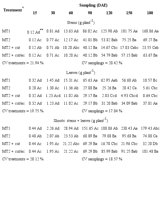 Data on the dry weight production (kg ha-1) of stems, leaves and shoots (stems + leaves) are shown in Table 3. The shoot dry weight production increased in MT1 and MT2 up to 150 DAE, reaching 11,921 and 19,135 kg ha-1, respectively, and declined from 150 to 180 DAE due to leaf drying and dropping (Tables 2 and 3). Fernandes et al. (1999) also reported a greater dry weight production by increasing density from 100,000 to 200,000 plants ha-1, what is consistent with the results obtained in the present study.