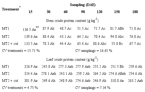 The results indicate that the stem crude protein content (Table 4) exhibited the same behavior for all the treatments, decreasing from 15 to 30 DAE, followed by an increase from 30 to 60 DAE (maximum protein content) and then a sharp drop (about 80 %) from 60 to 80 DAE, remaining low until 180 DAE. There was no difference in the leaf crude protein content among the treatments for the different sampling times, except at 150 DAE, when it was 9.1 and 23.6 % higher for MT2 and MT2 + cut plants, respectively, than those in MT1. The greater plant density in MT2 and cutting in MT2 + cut delayed flowering, when compared to MT1, what may justify the differences observed at 180 DAE. This corroborates other studies that demonstrated that plant growth is adversely affected by increasing plant densities, and that N yield (and consequently, crude protein) tends to increase at greater plant densities (Ahlawat & Saraf 1981). Moreover, the leaf crude protein content in all the treatments (Table 4) was between 243.1 and 326.9 kg ha-1 (corresponding to 24.31 and 32.69 %, respectively), what is higher than the average of 19.29 % reported by Valadares Filho et al. (2010) and Vieira (2011). As the plant age increased, the forage crude protein tended to decrease (Table 4), what is in agreement with Tenakwa et al. (2022), who stated that, as forage mature, tissues become more fibrous, and protein and energy levels decrease.