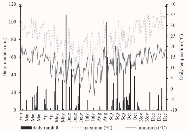 According to the Köppen classification, the region is Cfa, with humid subtropical climate, presenting an average rainfall rate of 1,881 mm and average air temperature of 19.1 ºC (Alvares et al. 2014), with well-defined summer and winter seasons and without a defined dry season (Silva Filho et al. 2021). Figure 1 presents the meteorological data during the experiment.