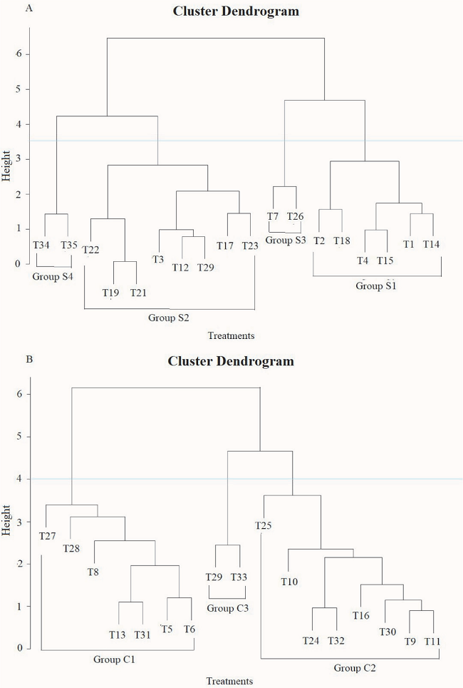 In the dendrograms with only intercropped systems (Figure 2), the cover crops were subdivided into three groups with similar data behavior: group C1 with the treatments T5 [RX 520 (white oat + rye + field pea + pivoting turnip)], T6 [RX 410 (oat IPR Afrodite + black oat + fodder radish)], T8 (buckwheat + millet), T13 (Crotalaria juncea + fodder radish), T27 (common oat + millet), T28 (common oat + millet + fodder radish) and T31 (black oat + millet + fodder radish); group C2 with T9 (millet + fodder radish + buckwheat), T10 (millet + fodder radish), T11 (C. juncea + millet), T16 (Coracana eleusine + millet), T24 (white oat + hairy vetch + fodder radish), T25 (white oat + hairy vetch + fodder radish + millet), T30 (black oat + millet) and T32 (black oat + millet + fodder radish); group C3 with T20 (fodder radish + hairy vetch) and T33 (black oat + millet + fodder radish + hairy vetch). It is possible to observe some tendencies in the crops of each group, being the group C1 the one that presents only 2 treatments among the 7 composed by legumes (T5 with field pea and T13 with Crotalaria Juncea), and all the groups, except for the T13, present grasses as one of the species. Meanwhile, the group C2 has grasses in all the treatments, and the main one is the millet crop, which is not only present in the T24 treatment, composed by white oat, pea and fodder radish. Finally, the group C3 presents hairy vetch and fodder radish in all the treatments.