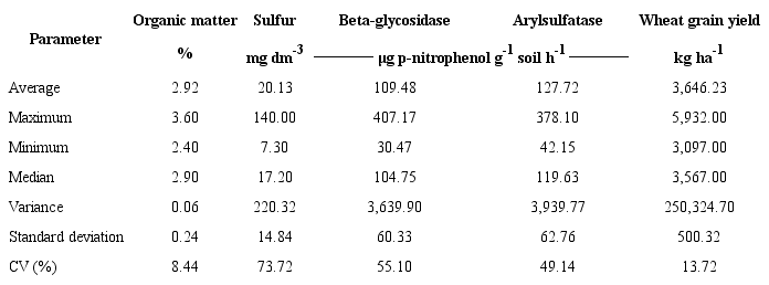 The results regarding the descriptive analysis of soil features are presented in Table 1. In relation to the coefficient of variation (CV), for Warrick & Nielsen (1980), the classification of the soil features is divided into low (CV < 12 %), moderate (12 % < CV < 60 %) and high (CV > 60 %) variability. Therefore, the data presented a low variability for organic matter, moderate variability for both enzymes and a high variability for sulfur contents in the soil. The coefficient of variation for the wheat grain yield was only 13.7 %, being considered a moderate variation.