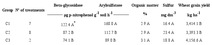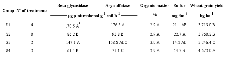 The groups presented medium values for the variables (Table 2). It is possible to observe that the S1 and S2 groups differed from each other only due to the enzymatic activities, presenting organic matter and sulfur contents in the soil and wheat grain yield without a significative difference. So, despite this variation in the enzymatic activity, there was no relation to wheat grain yield, when comparing the groups S1 and S2.