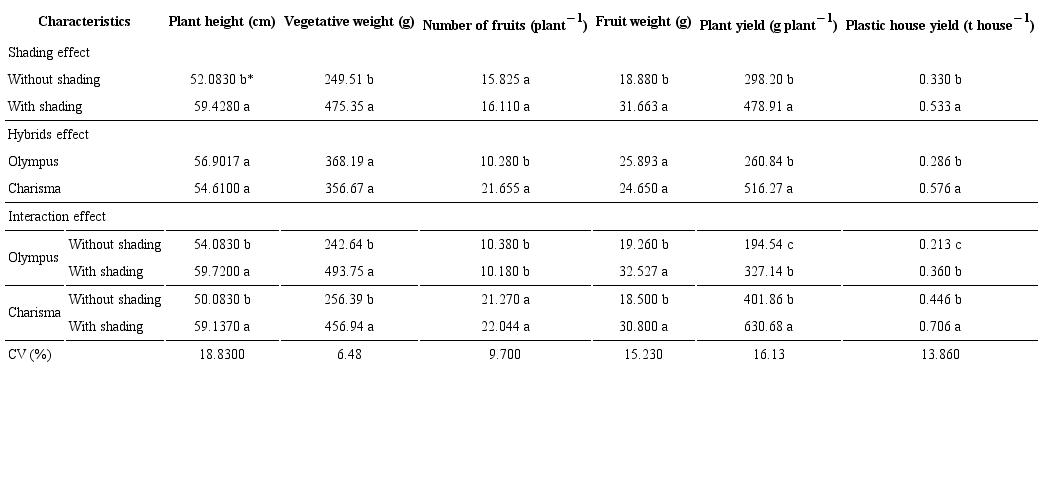 On the other hand, the results showed that there are significant differences between the interaction treatments. The highest values for plant height, number of fruits, plant yield and plastic house yield, which reached 59.137 cm, 22.044 fruits plant−1, 630.68 g plant−1 and 0.706 t plastic house−1, were observed for the interaction treatment of the Charisma hybrid with shading. But there was no difference in relation to the no-shading treatment for the same hybrid, concerning the number of fruits, while the shading treatment with the Olympus hybrid had the highest values for plant height (59.720 cm), vegetative weight (493.75 g) and fruit weight (32.527 g). But there were no significant differences for the shading treatment with the Charisma hybrid. These results clearly indicate the significant positive effect of shading in improving the sweet pepper growth and yield, although the shading treatment lasted for only two months.